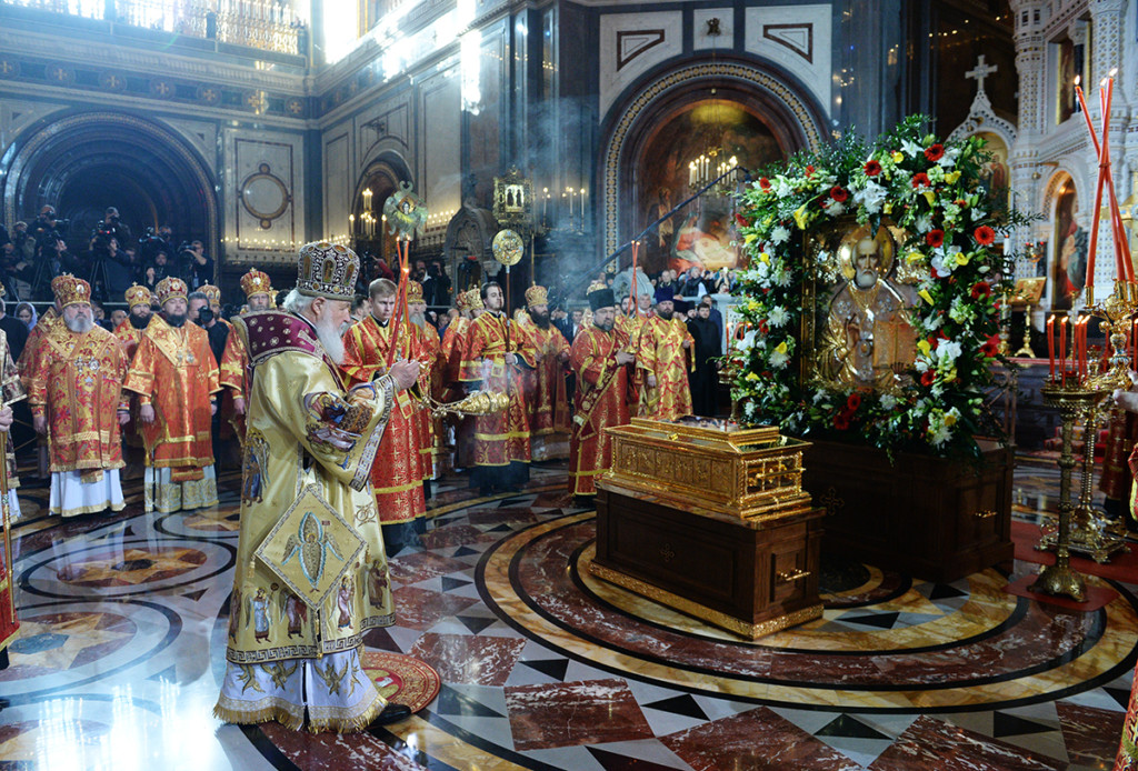 В канун дня празднования перенесения мощей святителя Николая Чудотворца из Мир Ликийских в Бар (1087), Святейший Патриарх Московский и всея Руси Кирилл возглавил всенощное бдение и встречу мощей святителя в кафедральном соборном Храме Христа Спасителя г. Москвы.